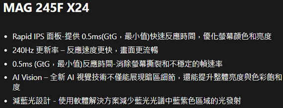 MSI微星 MAG 245F X24 24型 16:9 23.8吋 電競螢幕 (IPS/1ms/240Hz/2H1DP)
