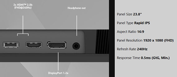 23.8吋,比例16:9,Rapid IPS平面,解析度1920*1080(FHD),刷新率240Hz、,反應時間1ms(GtG),對比度1000:1,動態對比度(DCR)100000000:1,亮度(nits)300cd/m2,介面:2*HDMI 2.0b、1*DisplayPort 1.2a,支援HDCP,防閃爍減藍光設計,全新AI Vision技術,Adaptive Sync技術,,3年保固