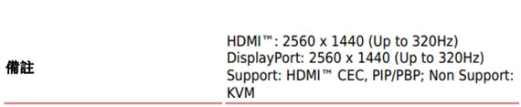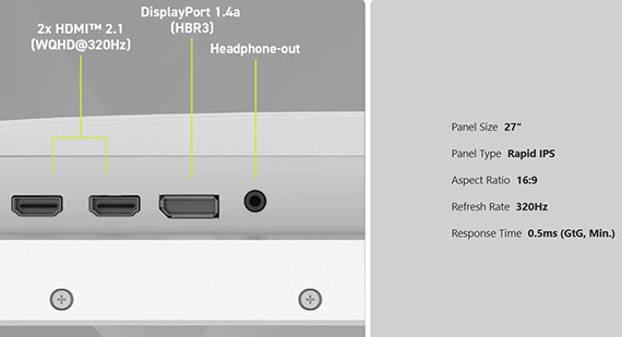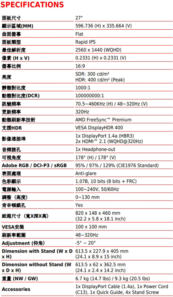 27吋,比例16:9,Rapid IPS 平面,解析度2560*1440(WQHD),刷新率320Hz,反應時間0.5ms(GtG, Min.),對比度1000:1,動態對比度(DCR)100000000:1,亮度(nits)SDR:300cd/m2、HDR:400cd/m2,介面:2*HDMI 2.1、1*DisplayPort 1.4a,支援HDCP,防閃爍減藍光設計,全新AI Vision技術,Adaptive Sync技術,3年保固