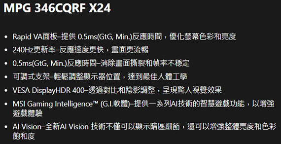 MSI微星 MPG 346CQRF X24 34型 21:9 34吋 曲面電競螢幕 (VA/0.5ms/240Hz/1C2H1DP)