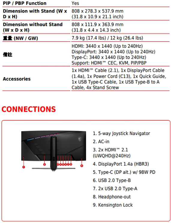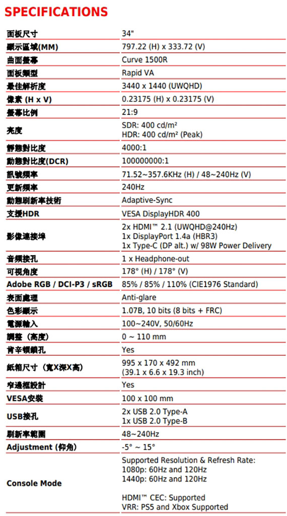 34吋,比例21:9,VA面板,曲面螢幕1500R曲率,解析度3440*1440(UWQHD),刷新率240Hz,反應時間0.5ms(GtG、Min.),對比度4000:1,動態對比度(DCR)100000000:1,亮度(nits)400cd/m2,介面:2*USB 2.0 Type-A、1*USB 2.0 Type-B、2*HDMI 2.1、1*DisplayPort 1.4a、1*Type-C,支援HDCP,可調式支架,全新AI Vision 技術,G.I.軟體–提供一系列AI技術的智慧遊戲功能,3年保固