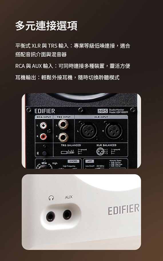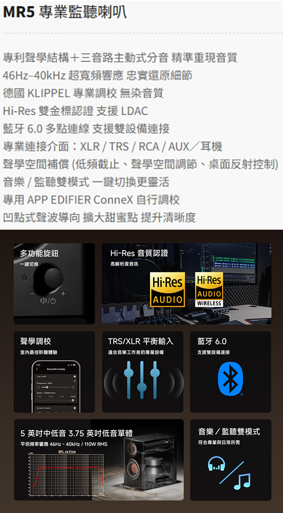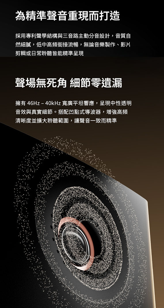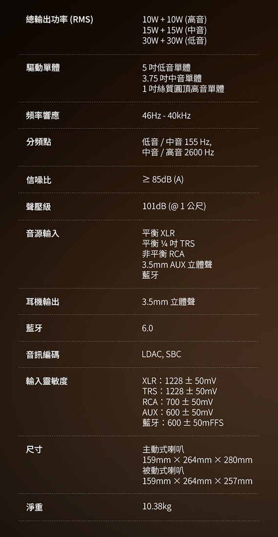 驅動單體:5 吋低音單體、3.75吋中音單體、1吋絲質圓頂高音單體,訊號源:平衡 XLR、平衡1/4吋TRS、非平衡RCA、3.5mm AUX立體聲、藍牙,專利聲學結構+三音路主動式分音,46Hz–40kHz超寬頻響應, 德國KLIPPEL專業調校,Hi-Res雙金標認證,藍牙6.0多點連線,凹點式聲波導向,保固:15個月 NCC認證碼: CCAH25LP6820T1 BSMI認證碼: R3B489