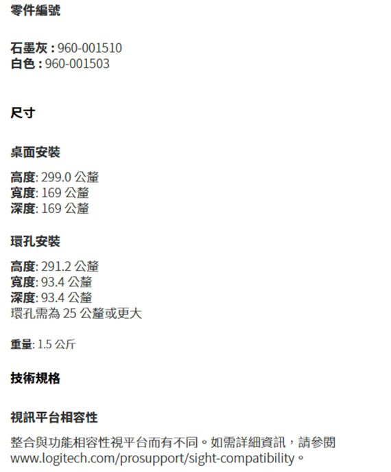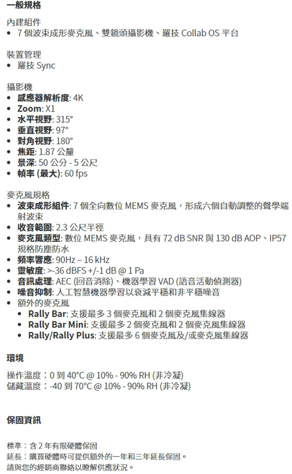 雙鏡頭攝影機、4K解析度、視野:水平315°、垂直:97°、對角:180°、7個波束成形麥克風、 具有AI智慧多人取景功能、針對不同的場所而設計(中型/方形/超長會議桌)、利用羅技Sync,輕鬆管理您的羅技視訊協作裝置、(960-001503)