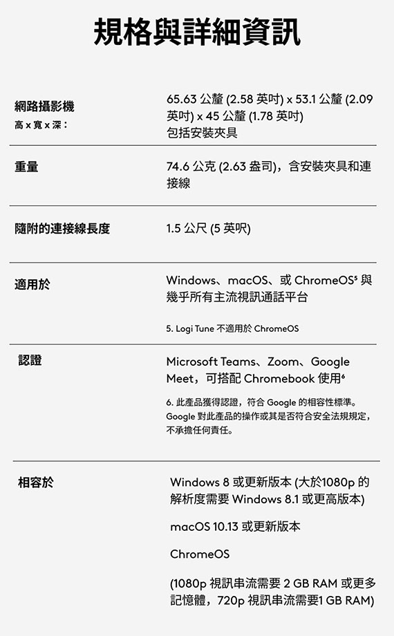 200像素、解析度1080p/30fps、720p/30fps、廣角視野: 70°、Type-C介面、具有自動光線校正、降噪麥克風、單聲道麥克風、(960-001472)