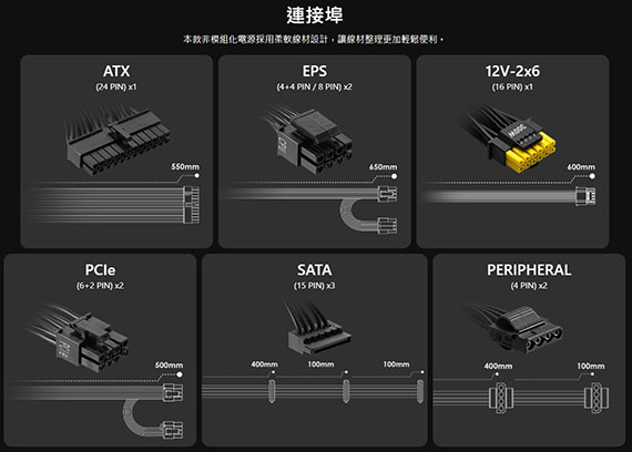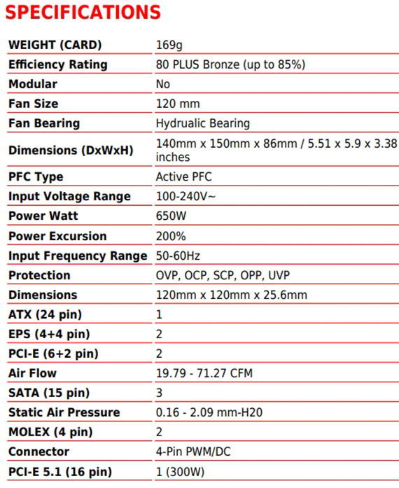 650W,80PLUS銅牌,電源採用DC-DC結構設計,120mm流體動力軸承風扇,線材:MB(24 pin)*1,EPS(4+4pin/8pin)*2,12V-2x6(16 PIN)*1,PCIe(6+2 PIN)*2,SATA(15PIN)*3 ,PERIPHERAL(4 PIN)*2,原生PCIe 5.1連接器,主動式 PFC 設計,工業級OVP、OCP、SCP、OPP、 UVP保護,5年保固。