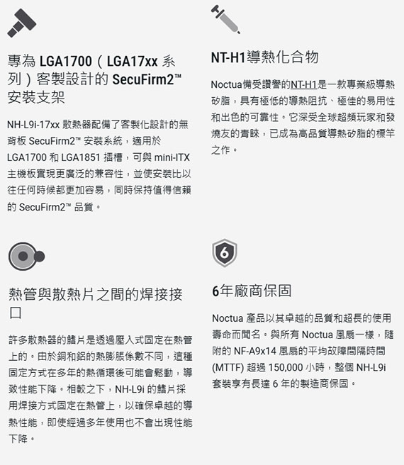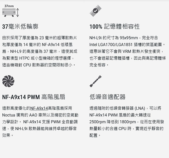 Intel:LGA1700,風量:33.8CFM(57.5m3/h),噪音值:23.6dB(A),尺寸(含扇,HxWxD):37x95x95mm,適用於小型機箱和HTPC環境,37mm超薄設計,100%的RAM相容性,保固6年