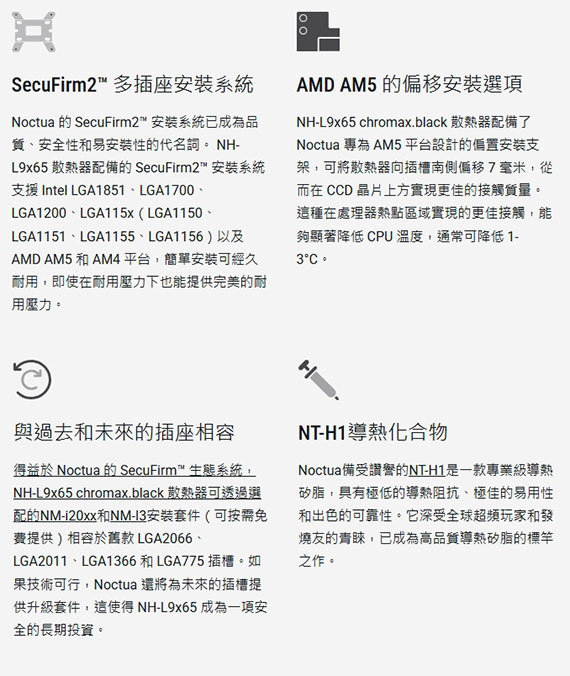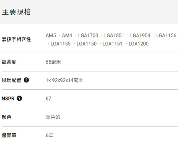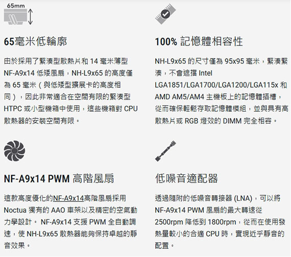 CPU腳位:Intel LGA1851/1700/1200/1156/1155/1151/1150,AMD:AM5/AM4,內建NF-A9x14 PWM風扇,風量57.5m3/h,轉速2500RPM±10%,噪音值23.6dBA,散熱器尺寸(含扇):95x95x65mm,高度為 65 毫米,高度緊湊、安靜的薄型散熱器,專為小型機殼和 HTPC 環境而設計,6年保固