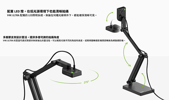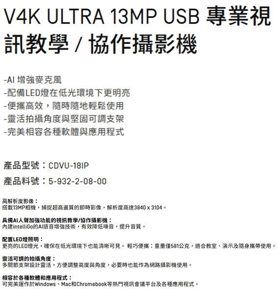 IPEVO V4K ULTRA 13MP USB 專業視訊教學/協作攝影機 (CDVU-18IP)