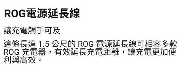 延伸充電器使用範圍,線長:1.5公尺(1.5米)/150公分(150cm),方便為 ROG Ally 掌上型遊戲機、相容的 ROG 筆電與手機充電,與 ROG 充電器相容