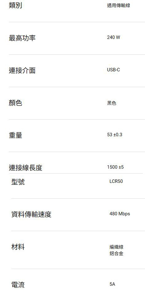 USB C公--C公,線長:1.5M公尺(1.5米)/150公分(150cm),內建 E-Marker 晶片,可調式電壓供應(AVS)技術,5A/240W(240瓦)快速充電,480Mbps資料傳輸,材質:編織線、鋁合金, 5000 次連接線彎折測試,10000 次插拔測試