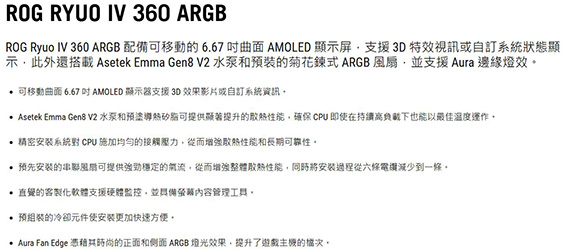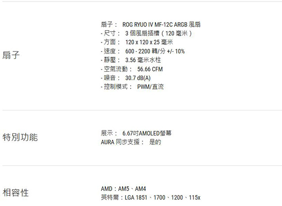 INTEL:LGA 1851、1700,AMD:AM5、AM4,ROG RYUO IV MF-12C ARGB風扇,尺寸120x120x25mm,風量71.44CFM,轉速500~2650RPM±10%,噪音值39.6dBA,靜壓5.15mm-H2O,6.67吋曲面AMOLED顯示器,散熱器尺寸:394x120x27mm,搭配ASUS InfoHub軟體,加厚32mm鋁製冷排設計,雙側ARGB燈效設計,保固6年 90RC01N1-B0TAY0