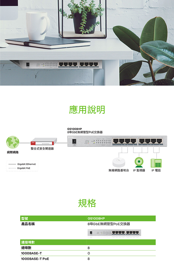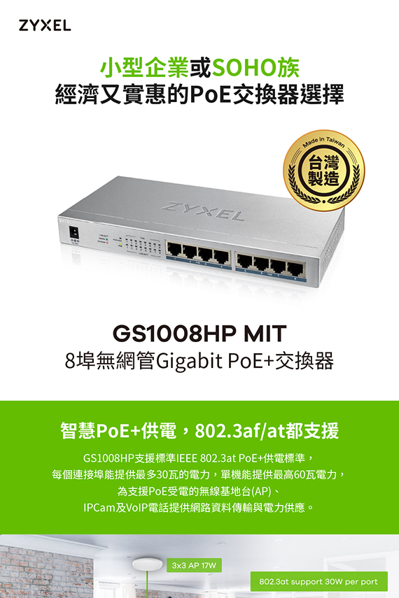 ZYXEL兆勤合勤 GS1008HP 8埠 無網管型Gigabit PoE+交換器-MIT