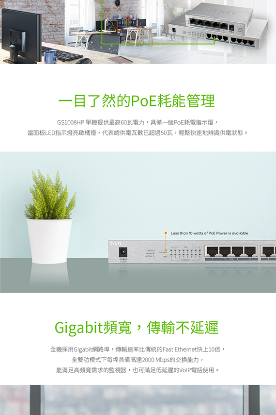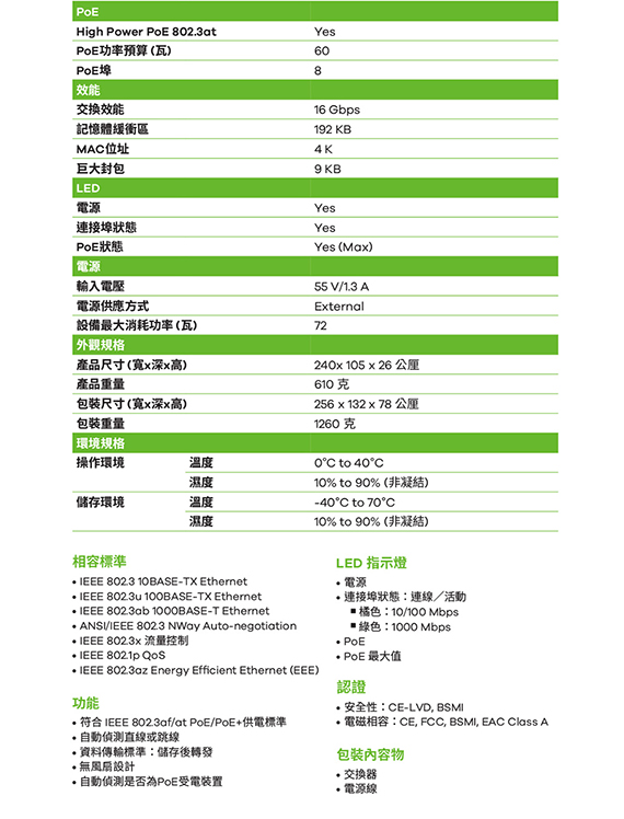 提供8埠 10/100/1000Mbps RJ-45埠,支援自動偵測直線或跳線,符合 IEEE 802.3af/at PoE/PoE+供電標準,可提供最高60瓦的電力供應,隨插即用,不須額外配置電力來源,支援巨大封包 9 KB,無風扇設計,可壁掛式安裝,尺寸(寬x深x高):240x105x26mm,重量約610g,台灣製 BSMI認證碼: D41163
