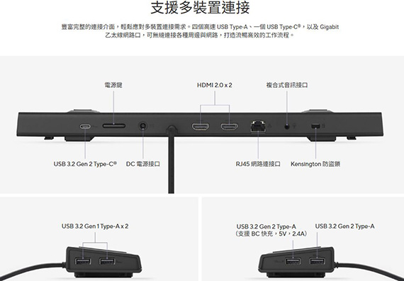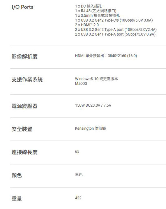 USB-C介面,USB 3.2 Gen2 Type-C*1,DC 輸入插孔*1,RJ-45 *1, 3.5mm*1, HDMI 2.0*1,USB 3.2 Gen2 Type-A port*2, USB 3.2 Gen1 Type-A port*2,解析度:HDMI 單外接輸出:3840*2160 (16:9),可調式的筆電支架, 將筆電抬升至舒適的視角,內建兩組 HDMI接口,支援雙螢幕 4K 60Hz 輸出,四個高速 USB Type-A 接口,最高100W充電,舒適人體工學設計,支援 4K 雙螢幕輸出,支援多裝置連接,高速傳輸與充電, 10Gbps資料傳輸速度, 快速啟動與 IT 管理,一年保固