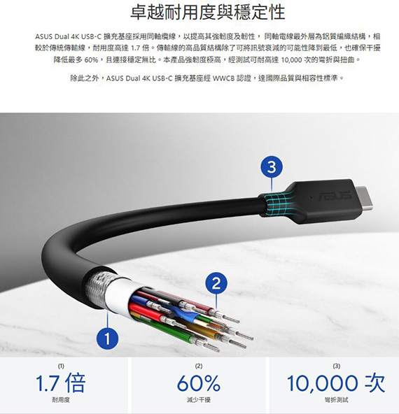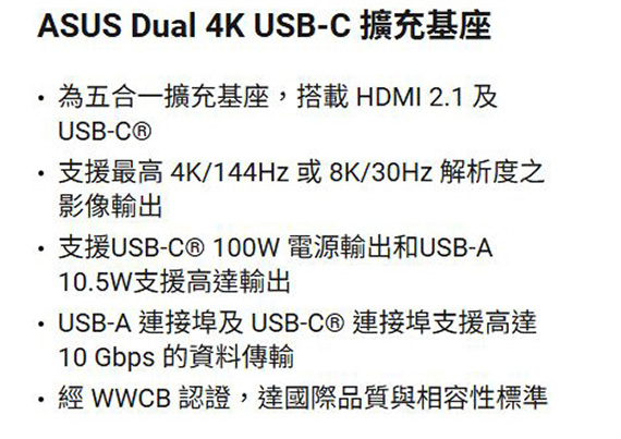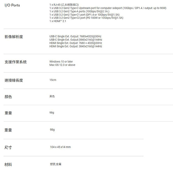 USB-C介面, USB 3.2 Gen2 Type-C1 port *1,USB 3.2 Gen2 Type-C2 port*1,USB 3.2 Gen2 Type-C Upstream port for computer sideport*1,USB 3.2 Gen2 Type-A ports*1, HDMI 2.1*1,RJ-45 *1,支援解析度:USB-C Single Ext. Output: 7680x4320@30Hz、 USB-C Single Ext. Output:3840x2160@144Hz、HDMI Single Ext. Output: 7680 × 4320@30Hz、HDMI Single Ext. Output: 3840x2160@144Hz,連接線長度:15cm,搭載 HDMI 2.1 及 USB-C,支援USB-C 100W 電源輸出和USB-A 10.5W支援高達輸出,支援高達 10 Gbps 的資料傳輸, 採用同軸纜線,外層為鋁質編織結構,高達 10,000 次的彎折與扭曲,經 WWCB 認證,達國際品質與相容性標準,一年保固