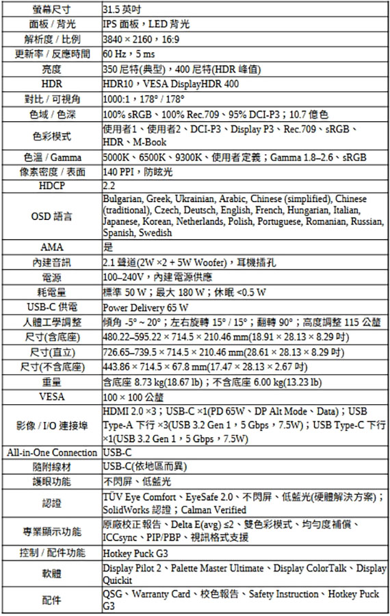 31.5吋,IPS面板,解析度3840x2160,60Hz更新率,反應時間5ms,對比1000:1,亮度350尼特,輸入介面:HDMI(2.0)*3、Type-C*1,支援HDCP,USB Type-A*3,USB Type-C*1,內建喇叭2.1 聲道(2Wx2+5W woofer),耳機插孔,不閃屏低藍光,多種傾斜、旋轉與翻轉調整角度,準確的色彩與正確的色域指引