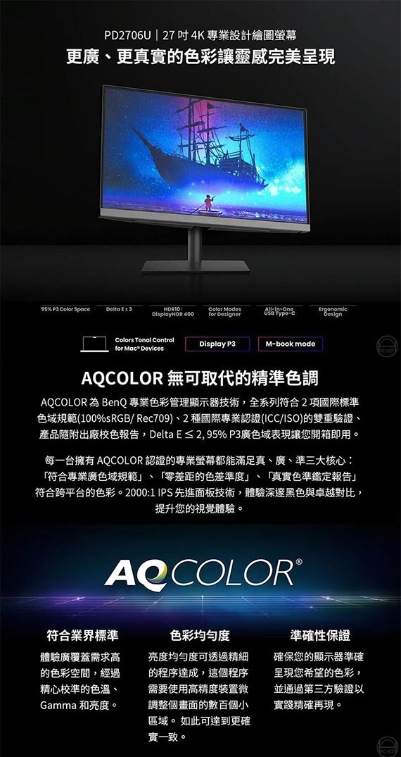 BenQ明基電通 PD2706U 27型 16:9 27吋 4K專業設計繪圖螢幕(IPS/5ms/60Hz/1H1DP1C/喇叭/可升降、旋轉)
