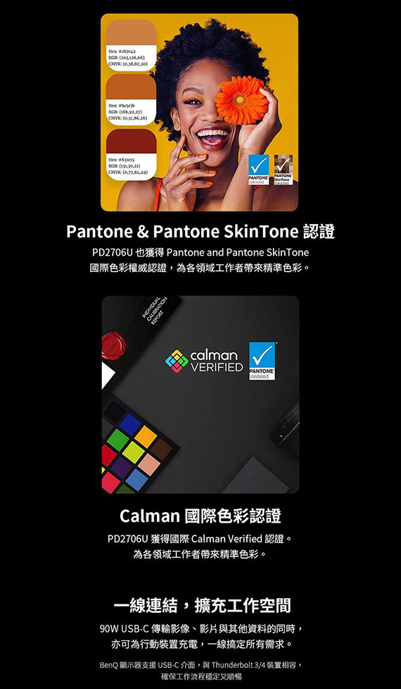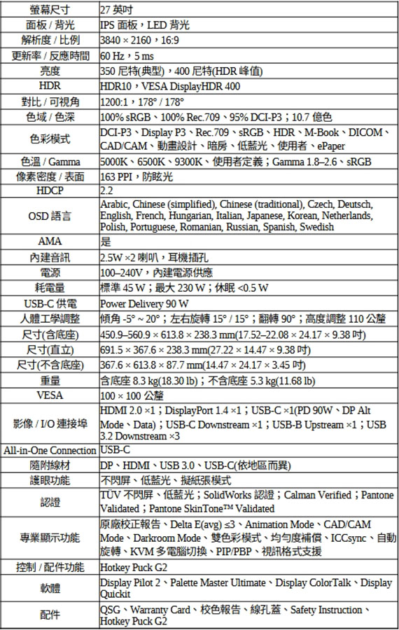 27吋,IPS面板,解析度3840x2160,60Hz更新率,反應時間5ms,對比1200:1,亮度350尼特,輸入介面:HDMI(2.0)*1、DisplayPort1.4*1、Type-C*1,支援HDCP,USB C*1,USB Type B*1,USB 3.2*3,內建喇叭2.5W*2,耳機插孔,不閃屏低藍光,多種傾斜、旋轉與翻轉調整角度,無可取代的精準色調