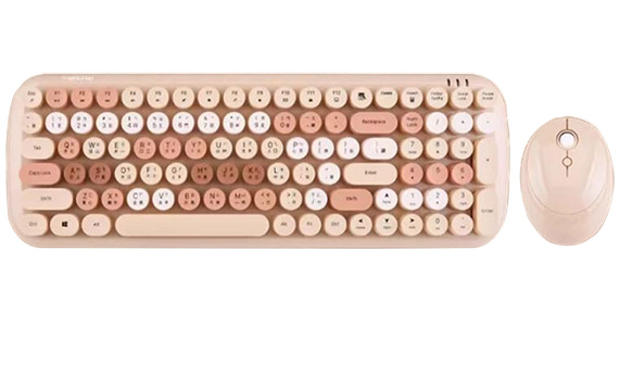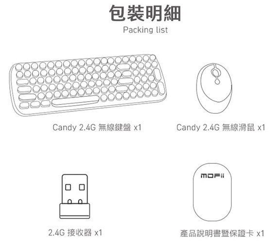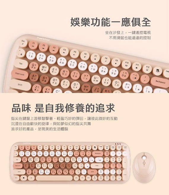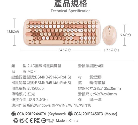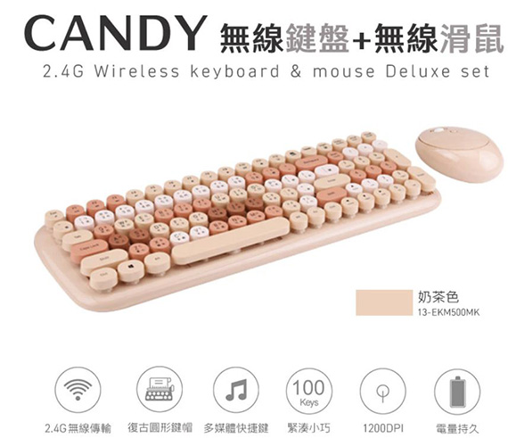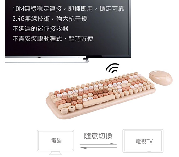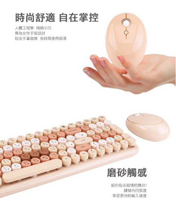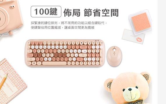 鍵盤:2.4G無線介面、100鍵、復古圓形鍵帽、多色混彩鍵帽設計、多媒體快捷鍵、滑鼠:解析度1200dpi、4按鍵、專為女性手型設計、磨砂觸感、使用3號電池(AA)*1(另購)