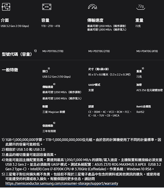 USB 3.2 Gen 2 (10 Gbps),讀取可達1050MB/s,寫入可達1000MB/s,採用再生鋁材打造,72克,RoHS2,認證:CE、BSMI、KC、VCCI、RCM、FCC、IC、UL、TUV、CB、UKCA,支援UASP模式,三年有限期保固