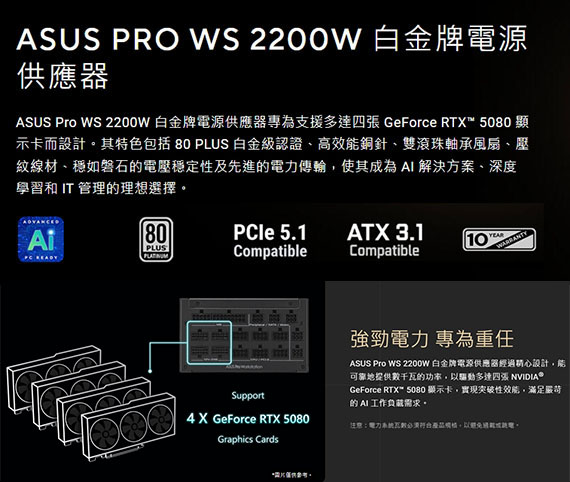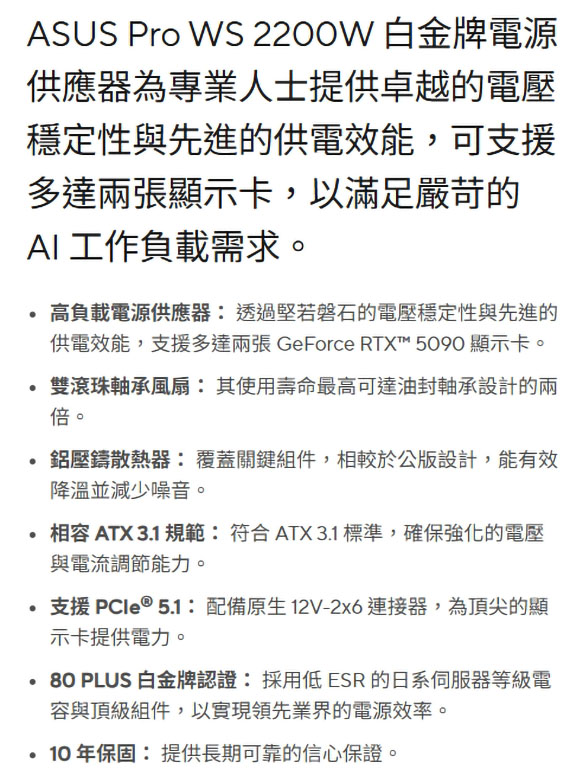 2200W,80 Plus白金牌認證,雙滾珠軸承風扇,連接埠:MB 24/20-pin*1、CPU 4+4-pin*2、PCIE 5.1 16-pin*4、PCIE 6+2-pin*4、SATA*12、PERIPHERAL*3,高負載電源供應器,支援多達四張 GeForce RTX 5090 顯示卡,擠壓成型鋁製散熱器,高效能銅針,符合ATX 3.1標準,支援 PCIe 5.1,10年免費保固