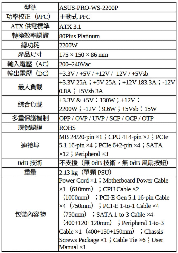 ASUS華碩 2200W ASUS-PRO-WS-2200P 80PLUS白金牌 ATX3.1 PCIe5.1 電源供應器 90YE00Z1-B0TA00