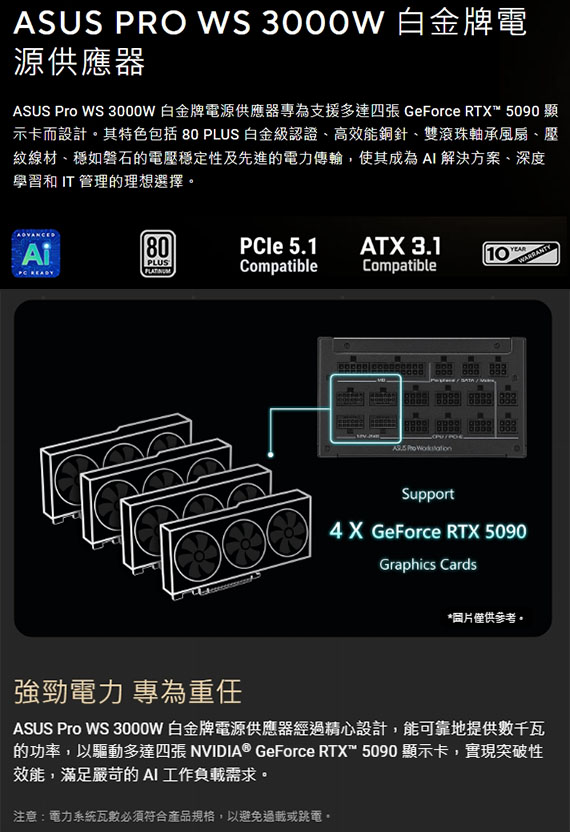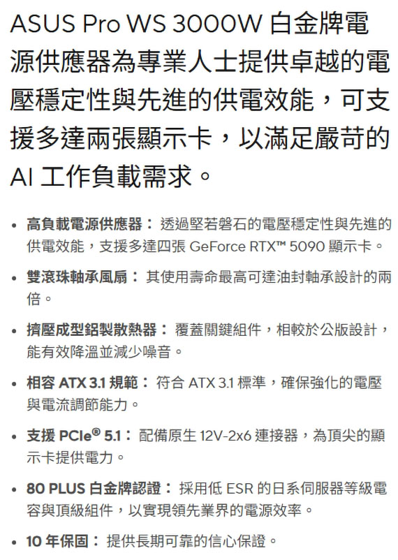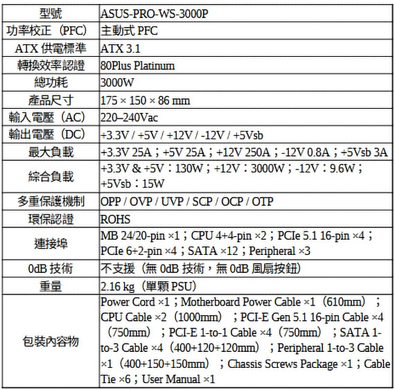 3000W,80 Plus白金牌認證,雙滾珠軸承風扇,連接埠:MB 24/20-pin*1、CPU 4+4-pin*2、PCIE 5.1 16-pin*4、PCIE 6+2-pin*4、SATA*12、PERIPHERAL*3,高負載電源供應器,支援多達四張 GeForce RTX 5090 顯示卡,擠壓成型鋁製散熱器,高效能銅針,符合ATX 3.1標準,支援 PCIe 5.1,10年免費保固