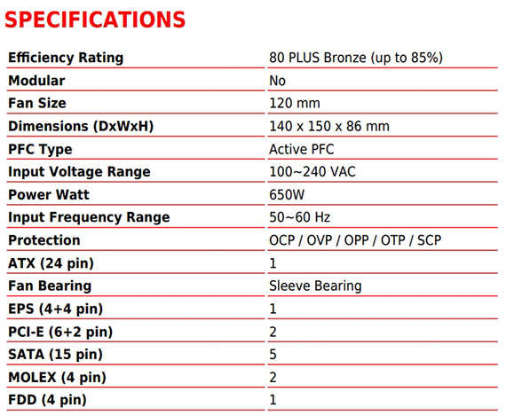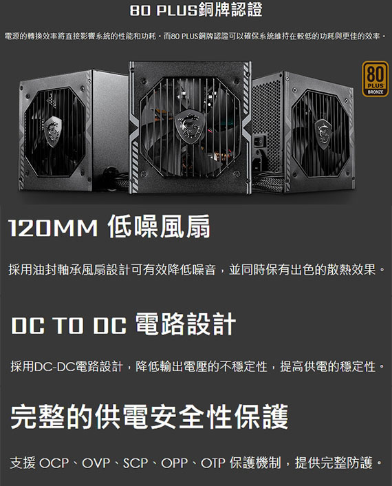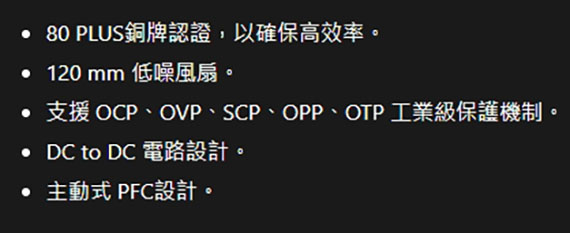 650W,80PLUS銅牌,單組+12V,120mm靜音風扇,線材接頭:MB(20+4pin)*1,EPS(4+4pin)*1,PCIe(6+2pin)*2,SATA*5,Molex*2,Floppy*1,支援 OCP、OVP、SCP、OPP、OTP 工業級保護機制,DC to DC 電路設計,主動式 PFC設計,五年保固 BSMI認證碼: R33008