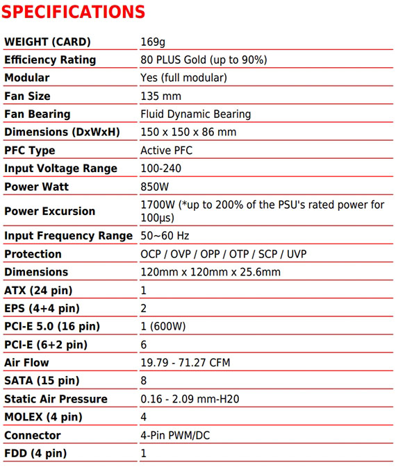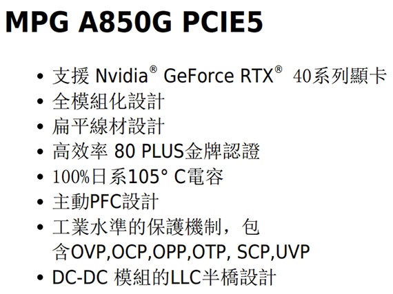 850W,80PLUS金牌,單組+12V,135mm液體動壓軸承風扇,線材接頭:MB(20+4pin)*1,EPS(4+4pin)*2,PCIe(12+4pin)*1,PCIe(6+2pin)*6,SATA*8,Molex*4,Floppy*1,支援 Nvidia GeForce RTX 40系列顯卡,扁平線材設計,主動PFC設計,工業水準的保護機制,包含OVP,OCP,OPP,OTP, SCP,UVP,DC-DC 模組的LLC半橋設計,十年保固 BSMI認證碼: R33008