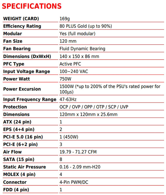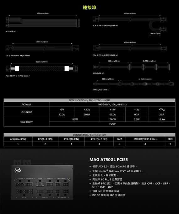 750W,80Plus金牌認證。採用DC-DC電路與全橋設計,120mm液態軸承風扇。線材:MB(24pins)*1,CPU(4+4pins)*2,PCIe 5.0(16pin)*1(450W),PCIe(6+2 pin)*3,SATA*8,Molex*4,Floppy*1。符合 PCIe 5.0 和 Intel PSDG ATX 3.0,支援NvidiaR GeForce RTX? 40系列顯卡,扁平線材,主動式PFC設計,工業水準的保護機制,包含OVP、OCP、OPP、OTP、SCP、 UVP,7年保固 BSMI認證碼: R33008