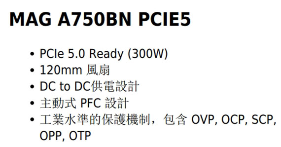 MSI微星 750W MAG A750BN PCIE5 80PLUS銅牌 ATX3.0 PCIe5.0 電源供應器