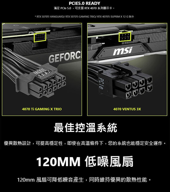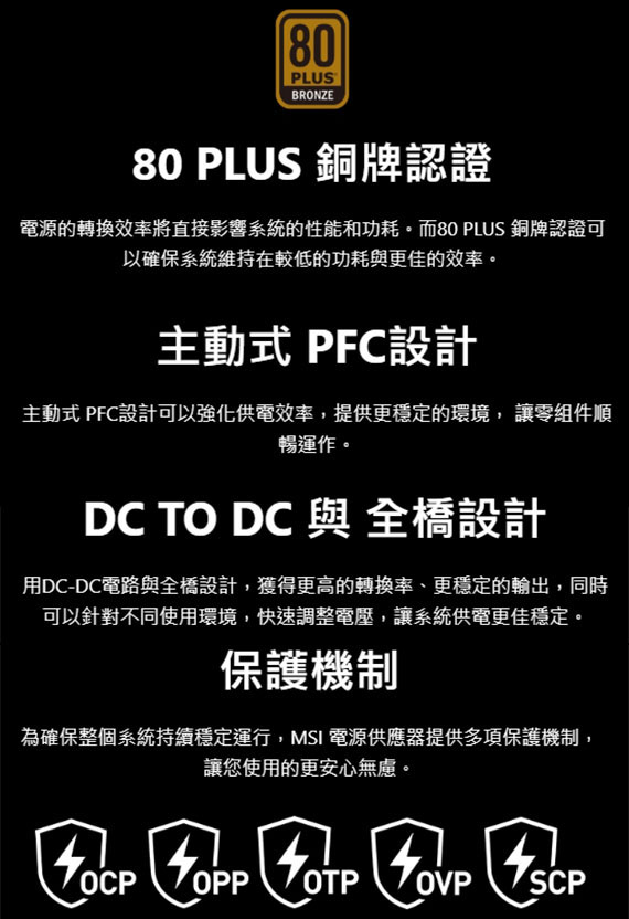 750W,80PLUS銅牌,採用DC-DC模組設計的LLC全橋拓撲,120mm流體動力軸承風扇。線材:MB(24 pin)*1,CPU(4+4 pin)*2,PCIe 5.0(16 pin)*1,PCIe(6+2 pin)*2,SATA*5,Molex(PERIPHERAL 4 pin)*2,Floppy*1。採用了扁平電纜,ATX 3.0相容,原生PCIe 5.0連接器,支援NVIDIA GeForce RTX 40系列顯示卡,主動式PFC設計,工業級OCP、OPP、OTP、OVP、SCP、UVP保護, 保固5年 BSMI認證碼: R33008
