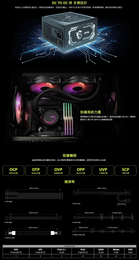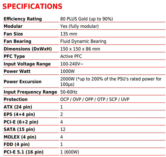 1000W、80plus金牌認證、單組+12V、135mm風扇、線材接頭:MB(20+4pin)*1、CPU(4+4pin)*2、PCIe(6+2pin)*4、PCI-E(16pin)*1、SATA*12、MOLEX*4、FDD*1、相容ATX 3.1,原生PCIe CEM 5.1連接埠、支援NVIDIA GeForce RTX 40 系列顯卡、全模組化扁平線材、主動式PFC設計、工業水準的保護機制、DC DC模組的LLC全橋設計