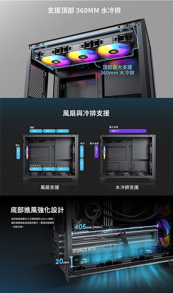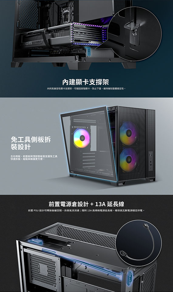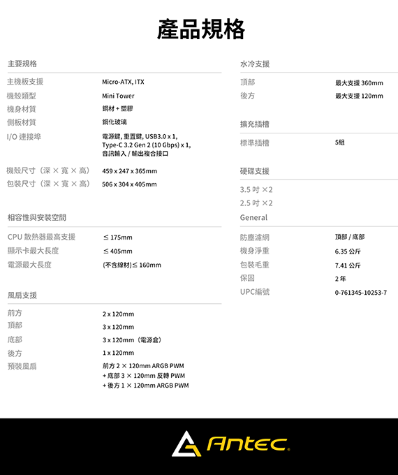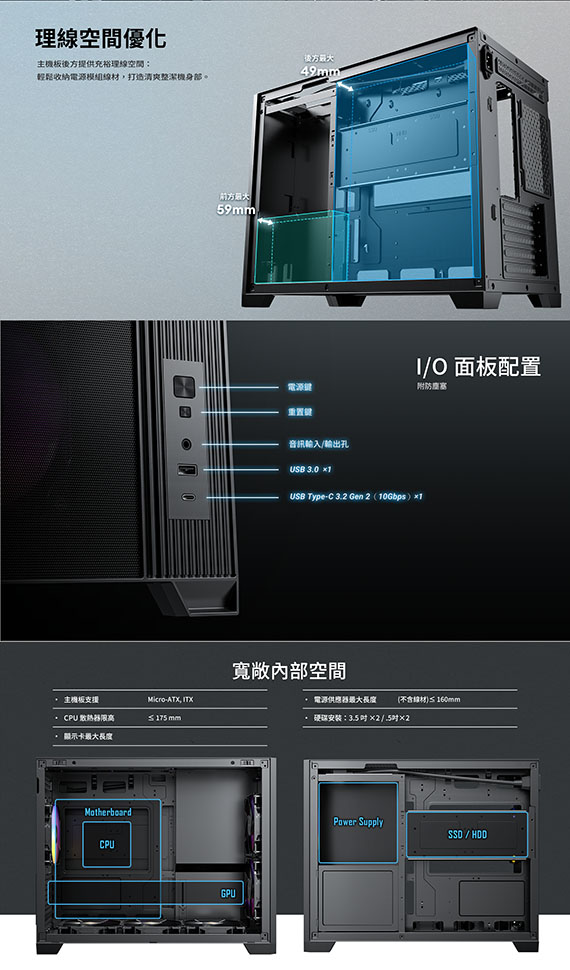 3.5吋*2,2.5吋*2,適用主機板:Micro-ATX/ITX,PCI擴充槽*5,CPU散熱限高175mm,顯卡GPU限長405mm,電源供應器PSU限長160mm,支援風扇(無標示內建即選購):前板(內建)120mm*2、上板120mm*3、底板(內建)120mm*3、後板(內建)120mm*1支援水冷(無標示內建即選購):上板360mm、後板120mm,I/O介面:Type-C*1、USB3.0*1、Audio*1,標配簡易型顯卡支撐架,電源前置的設計,2年保固