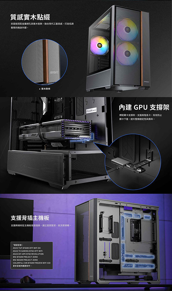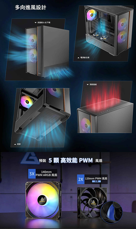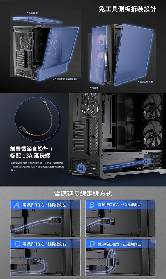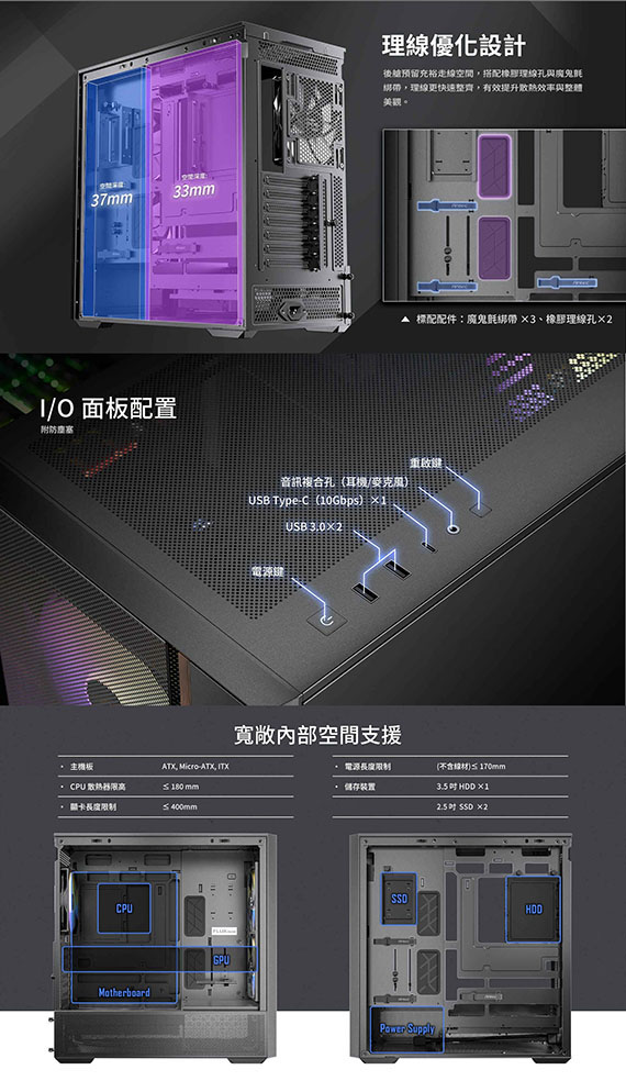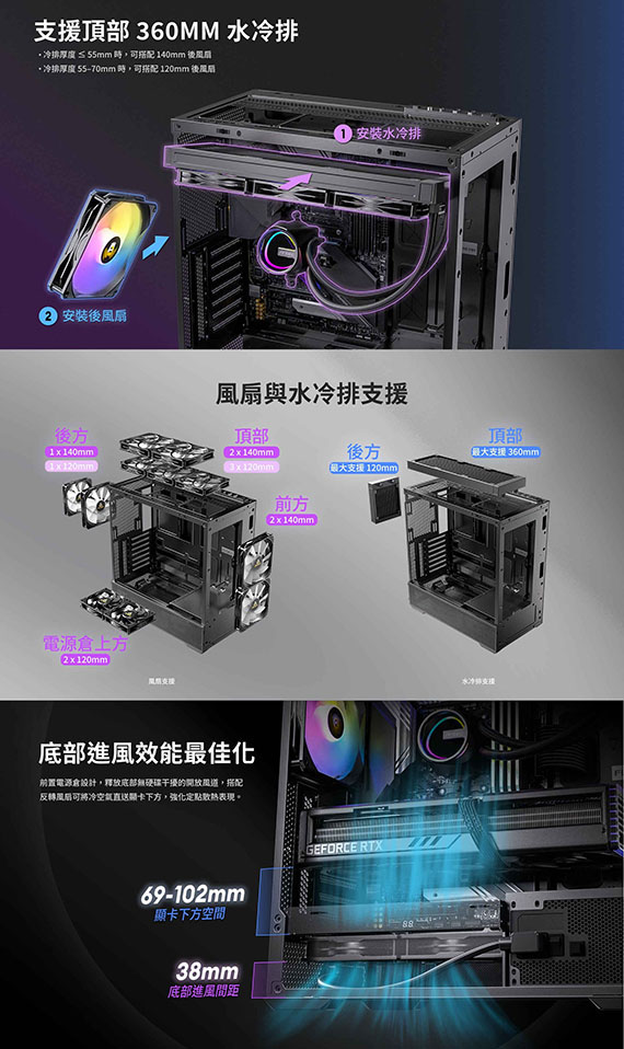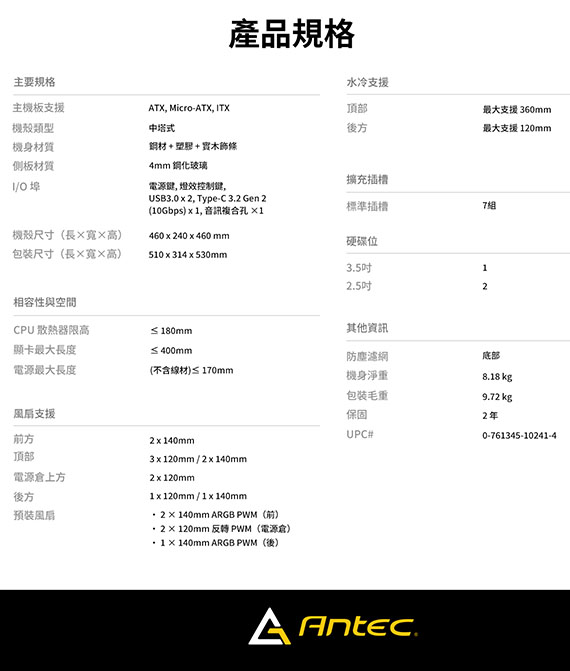 3.5吋*1,2.5吋*2,適用主機板:ATX/Micro-ATX/ITX,PCI擴充槽*7,CPU散熱限高180mm,顯卡GPU限長400mm,電源供應器PSU限長170mm,支援風扇(無標示內建即選購):前板(內建)140mm*2、上板120mm*3/140mm*2、底板(內建)120mm*2、後板(內建)140mm*1支援水冷(無標示內建即選購):上板360mm、後板120mm,I/O介面:Type-C*1、USB3.0*2、Audio*1,標配簡易型顯卡支撐架,電源前置的設計,2年保固