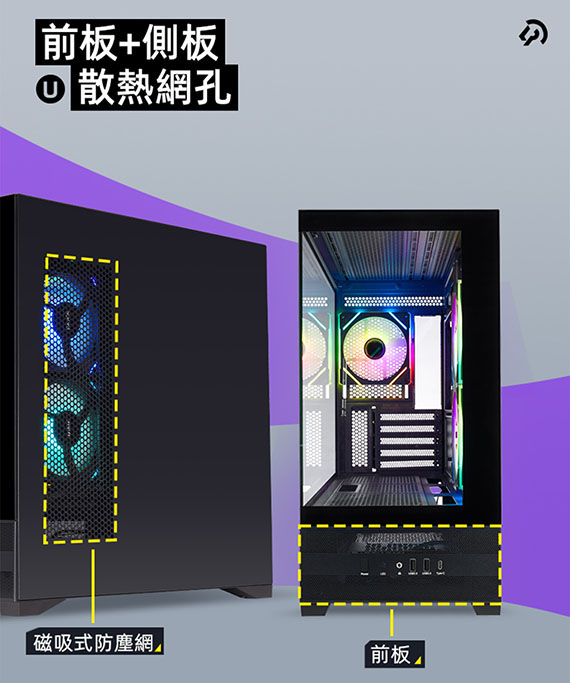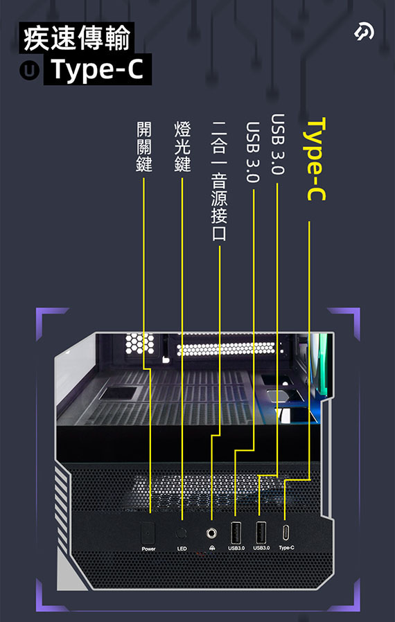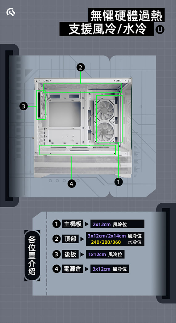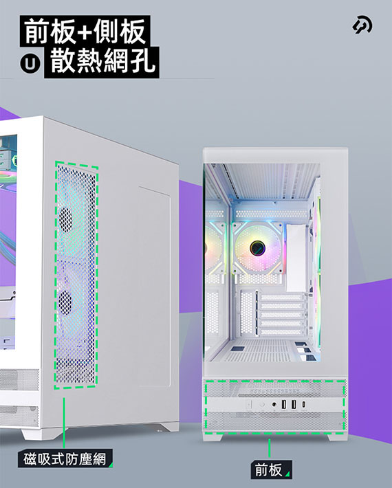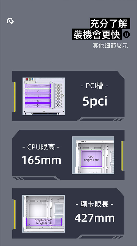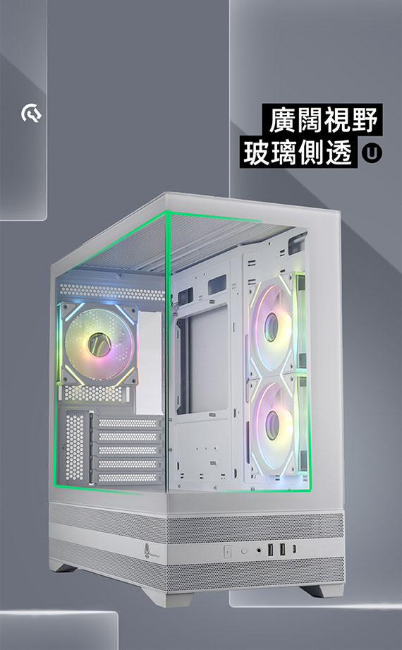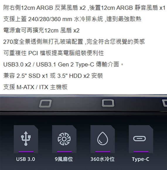 3.5吋*2(與2.5吋SSD共用*1),2.5吋*1,適用主機板:Micro-ATX/Mini-ITX,PCI擴充槽*5,CPU散熱限高165mm,顯卡GPU限長427mm,電源供應器260mm,支援風扇(無標示內建即選購):側板(內建)120mm*2、後板(內建)120mm*1、上板120mm*3、底板120mm*3,支援水冷(無標示內建即選購):上板240/280/360mm、後板120mm,I/O介面:Type-C*1、USB3.0*2Audio*1,270度全景透側無打孔玻璃配置