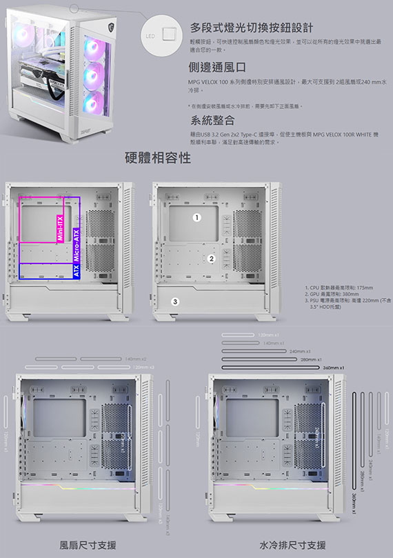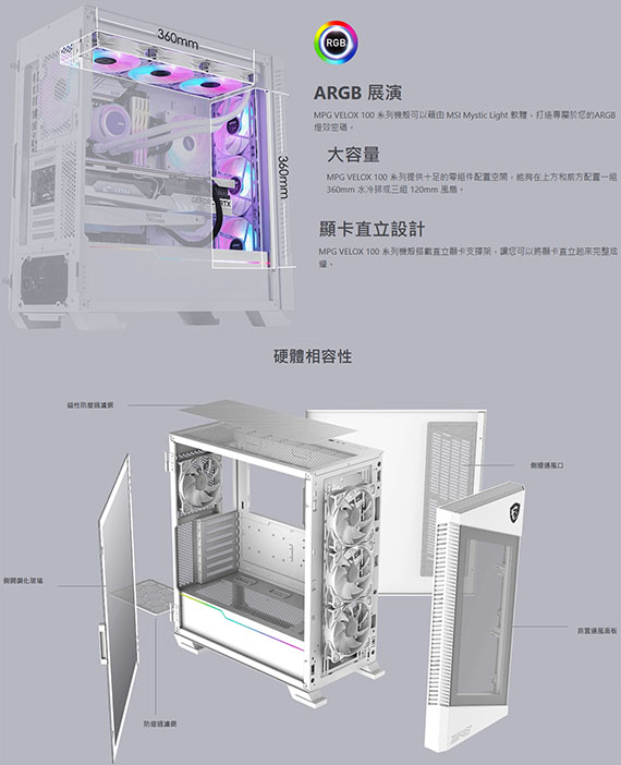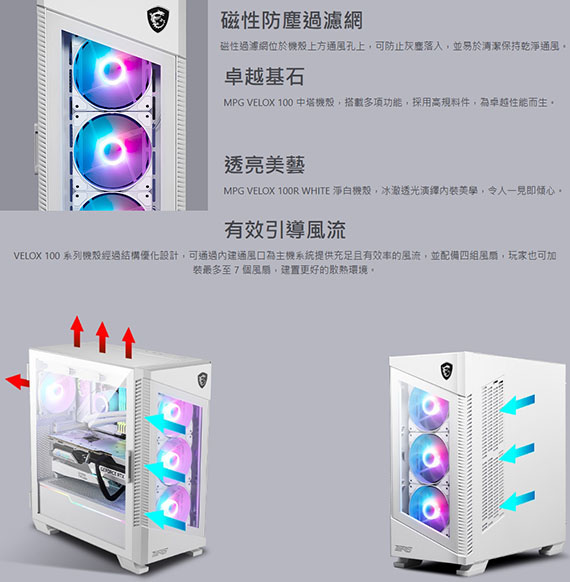 MSI微星 MPG VELOX 100R 白色 鋼化玻璃透側 ARGB 電競機殼
