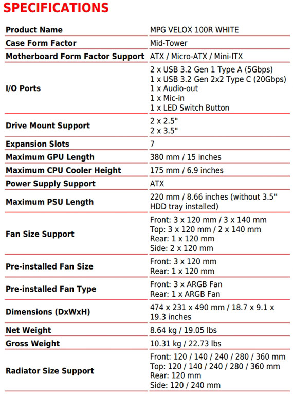 4小(2.5吋*2,3.5吋*2),適用主機板:ATX/Micro-ATX/Mini-ITX,PCI擴充槽*7,支援CPU散熱限高175mm,顯卡VGA限長380mm,電源供應器PSU限長220mm(未安裝3.5英寸硬盤托盤),支援風扇(無標示內建即選購):前板120/140mm*3(內建ARGB 120mm*3),後板120*1(內建ARGB 120mm*1),側板120/140mm*2,上板120mm*3/140mm*2,支援水冷(無標示內建即選購):前板120/240/280/360mm,後板120mm,側板120/240mm,上板120/240/280/360mm,I/O介面:Type-C USB3.2 Gen2x2*1,Type-A USB3.2 Gen1*2,Audio*1,MIC*1,支援顯卡直立設計,磁性防塵過濾網,採用3mm開門式鋼化玻璃,前置、側邊通風面板,尺寸474(W) x 231(D) x 490(H)mm,2年保固