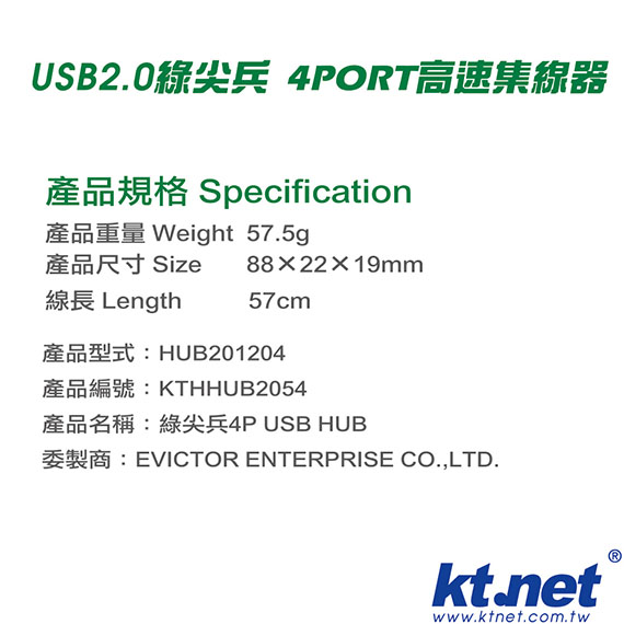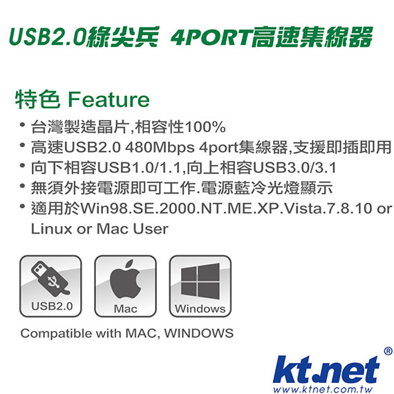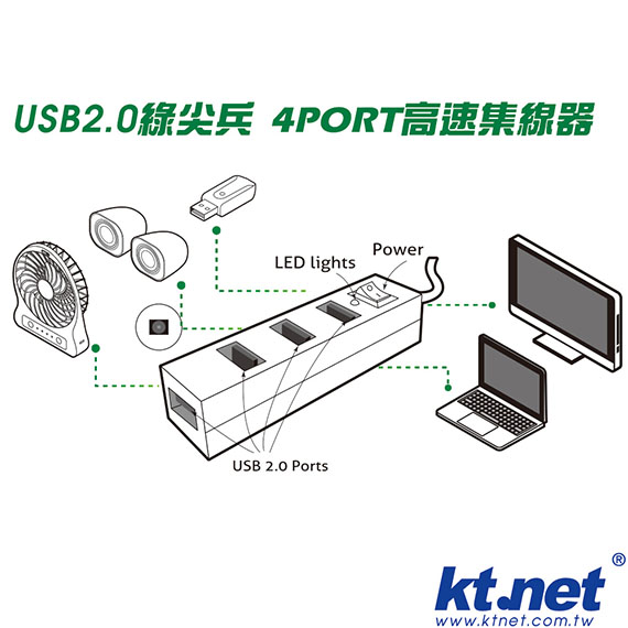KT.NET廣鐸 綠尖兵 白色 4埠 USB2.0 HUB集線器 (KTHHUB2054W)