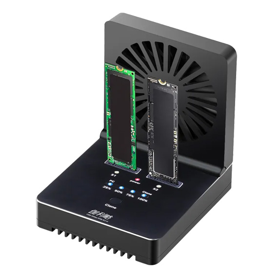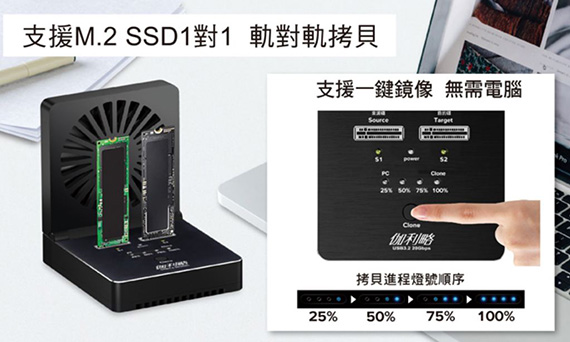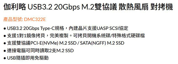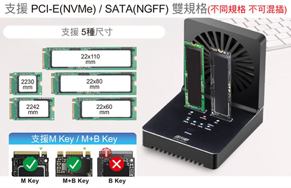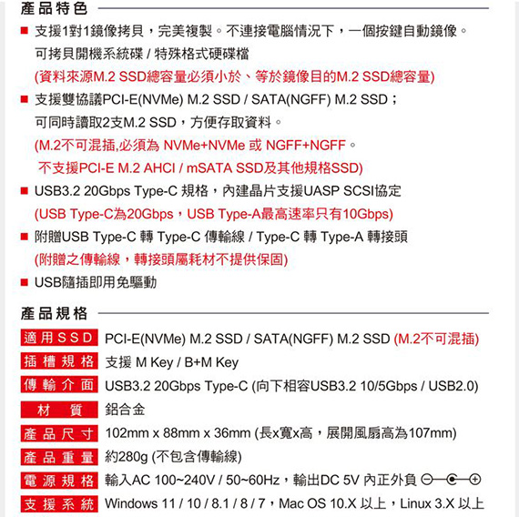 支援1對1鏡像拷貝,支援雙協議PCI-E(NVMe) M.2 SSD / SATA(NGFF) M.2 SSD,可同時讀取2支M.2 SSD,M.2不可混插,必須為 NVMe+NVMe 或 NGFF+NGFF,不支援PCI-E M.2 AHCI / mSATA SSD及其他規格SSD,USB Type-C為20Gbps