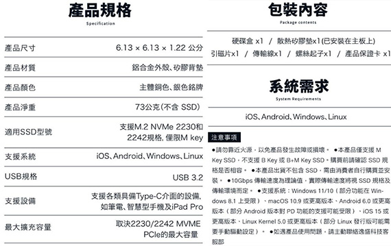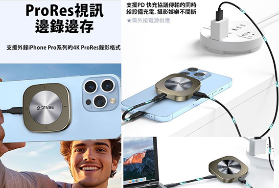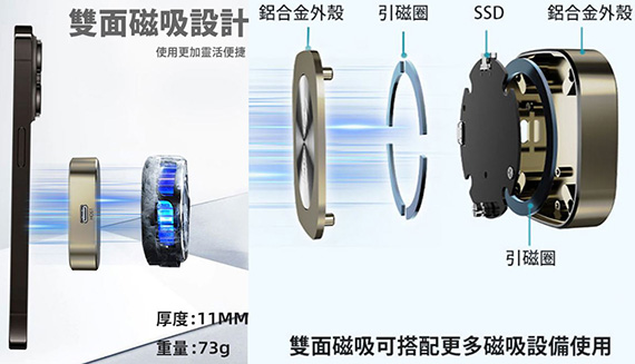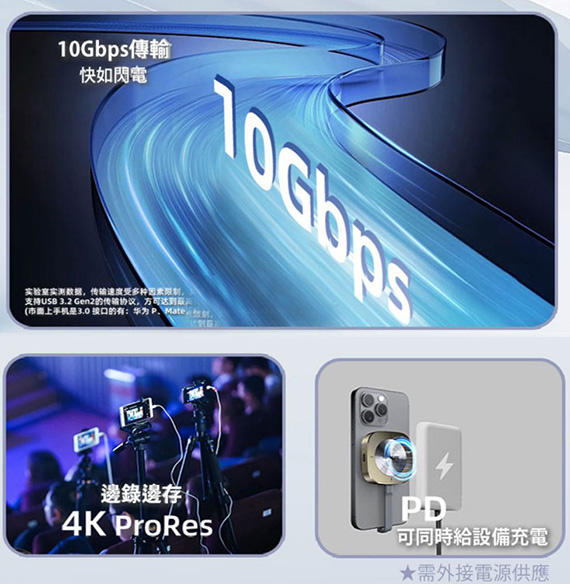 最高10Gbps傳輸速度、Type-C接口,支援多種設備(iPhone 15 以上型號可搭配附贈的C to C傳輸線使用)、支援外錄iPhone Pro系列的4K ProRes錄影格式、金屬外殼設計、雙面磁吸設計、矽膠背墊止滑 BSMI認證碼: D36046