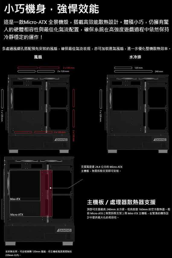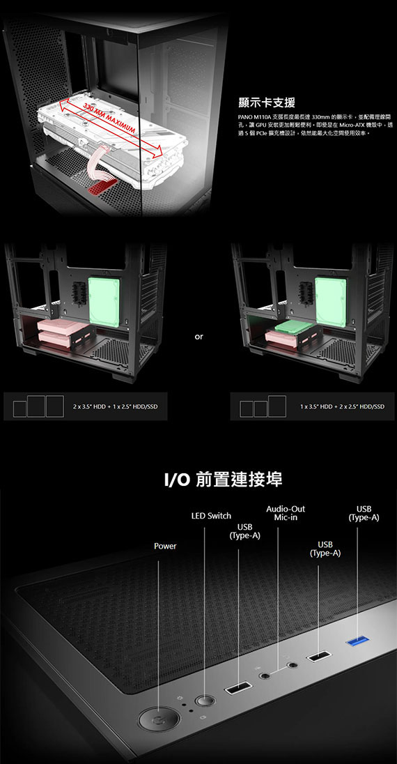 2.5吋*1、3.5吋*2,適用主機板:Micro-ATX、Mini-ITX,PCI擴充槽*5,支援CPU散熱限高160mm,最大GPU長度330mm,電源支援最大160mm,支援風扇(無標示內建即選購):後部120mm*1(內建RGB 120mm*1),頂部120mm*2/140mm*2(內建RGB 120mm*2),側面120mm*2,底部120mm*2,支援水冷(無標示內建即選購): 後部120mm,頂部120/240mm,I/O:USB (Type-A)*2,USB 5Gbs (Type-A)*1,Audio-Out*1, Mic-in*1,LEDOn/Off Button*1,Power Button*1,支援24.4CM的Micro-ATX主機板,Auto RGB 風扇,內附系統風扇,磁吸式濾網,最佳化氣流設計,2年保固
