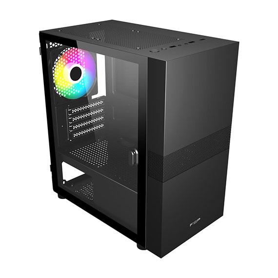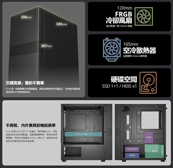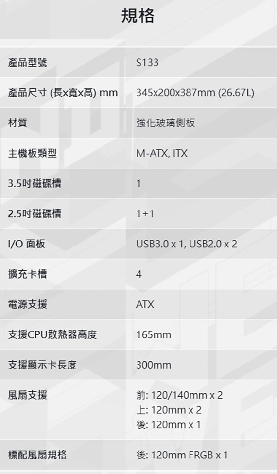 3.5吋*1,2.5吋*1+1,適用主機板:Micro-ATX/Mini-ITX,PCI擴充槽*4,支援CPU散熱限高165mm,顯卡VGA限長300mm,電源支援ATX,支援風扇(無標示內建即選購):後板120mm*1(內建)、上板120mm*2、前板120mm*2/140mm*2,I/O介面:USB3.0*1、USB2.0*2,搭載強化玻璃側板,洗鍊風格的外觀設計,配備一個 120mm FRGB風扇