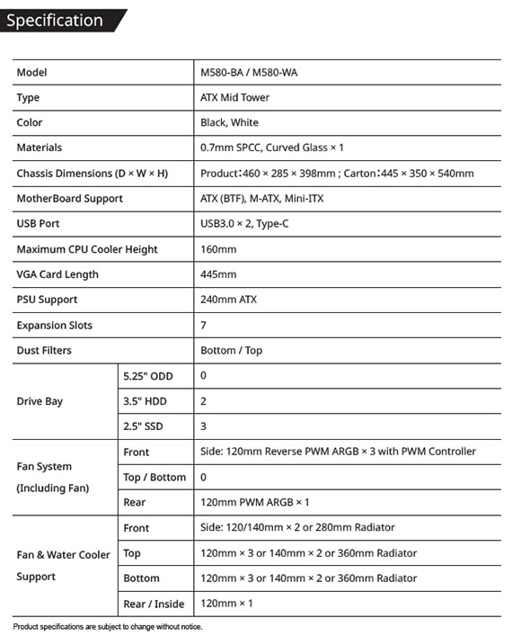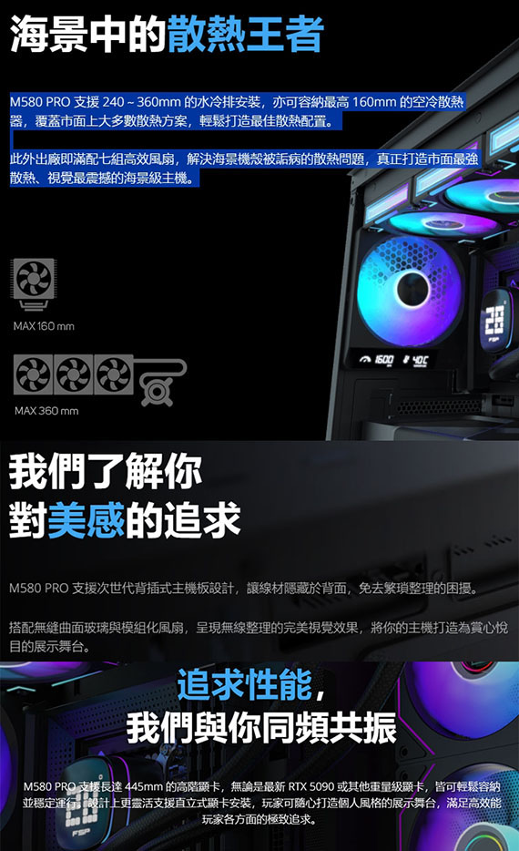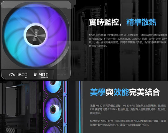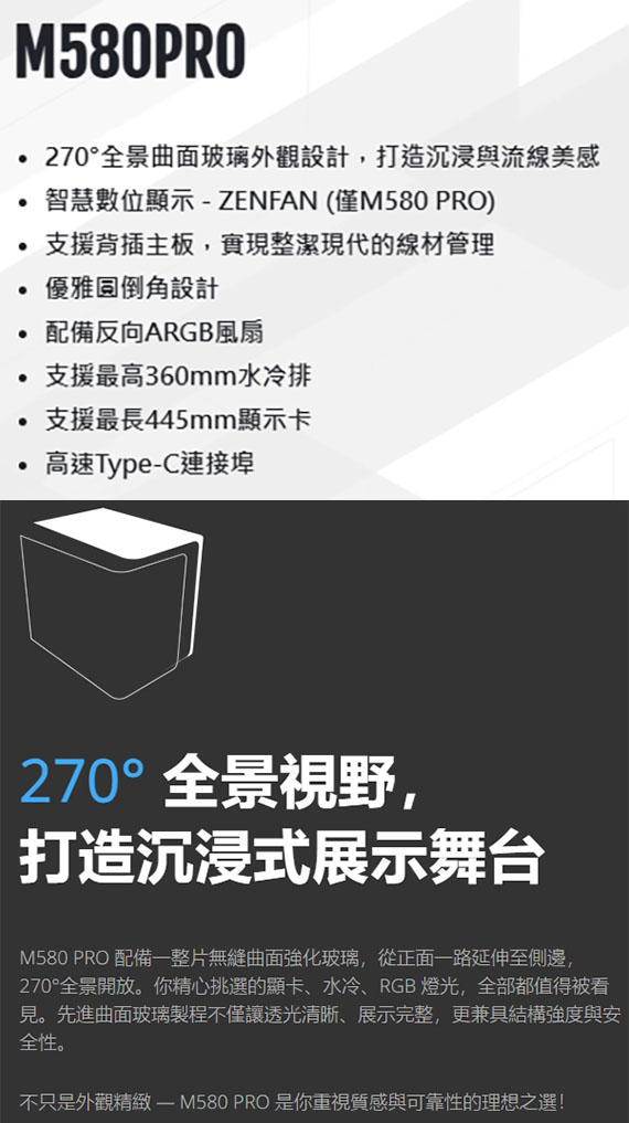3.5吋*1、2.5吋*2、適用主機板:ATX/Micro-ATX/Mini-ITX、PCI擴充槽*7、支援CPU散熱限高160mm、顯卡VGA限長445mm、電源供應器PSU空間240mm、支援風扇(無標示內建即選購):後板120mm*1(內建120mm ZENFAN 數顯風扇*1)、側板120mm*3(內建反向ARGB*3)/140mm*2、上板120mm*3/140mm*2、下板120mm*3(內建反向ARGB*3)/140mm*2、支援水冷(無標示內建即選購):上板360mm、下板360mm、I/O介面:Type-C*1、USB3.0*2、智慧數位顯示ZENFAN、支援背插主板、優雅圓倒角設計、270°全景曲面玻璃外觀設計