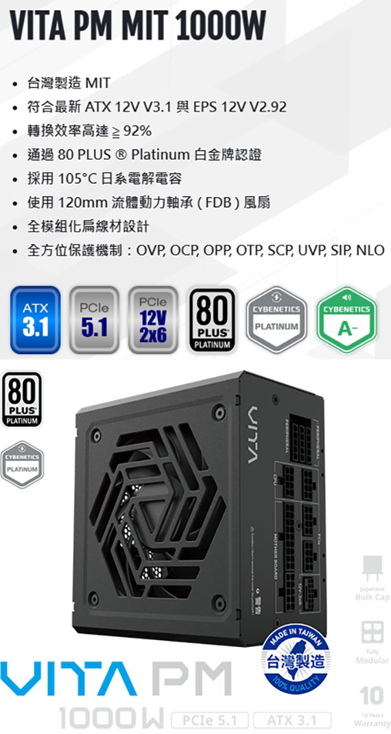 FSP全漢 1000W VITA-1000PM MIT 80PLUS白金牌 全模組化 ATX3.1 PCIe5.1 電源供應器 日系電容