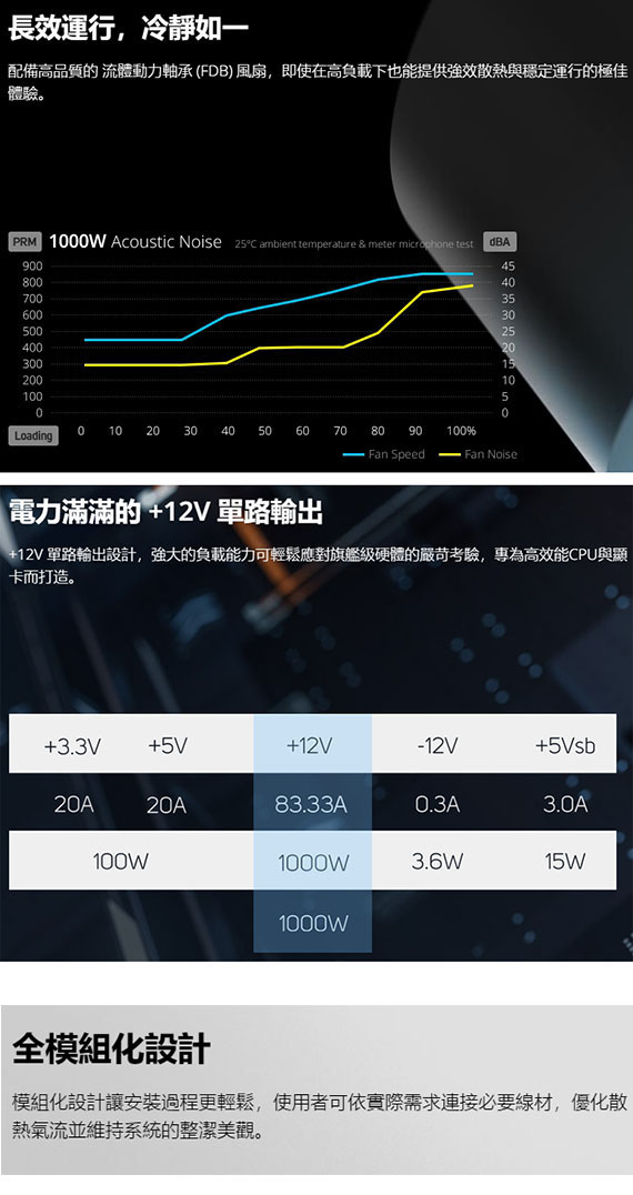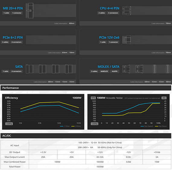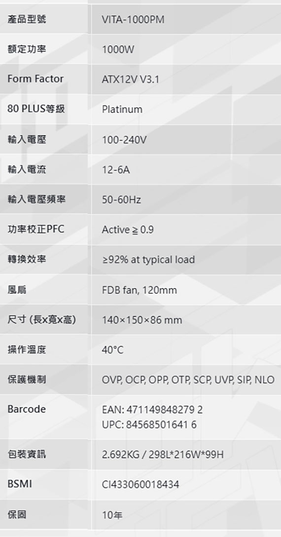1000W,80 PLUS Platinum 白金牌,ATX12V V3.1,FDB 120mm 風扇,線材:MB 20+4 PIN*1、CPU 4+4 PIN*2、PCIe 6+2 PIN*4、PCIe 12V-2x6*1、SATA*4、MOLEX/SATA*4,12V 單路輸出,尺寸140*150*86mm,105°C 日系電解電容,DC-DC 同步整流設計,LLC 諧振線路架構,全模組化扁線材設計,全方位保護機制:OVP、OCP、OPP、OTP、SCP、UVP、SIP、NLO BSMI認證碼: R43001