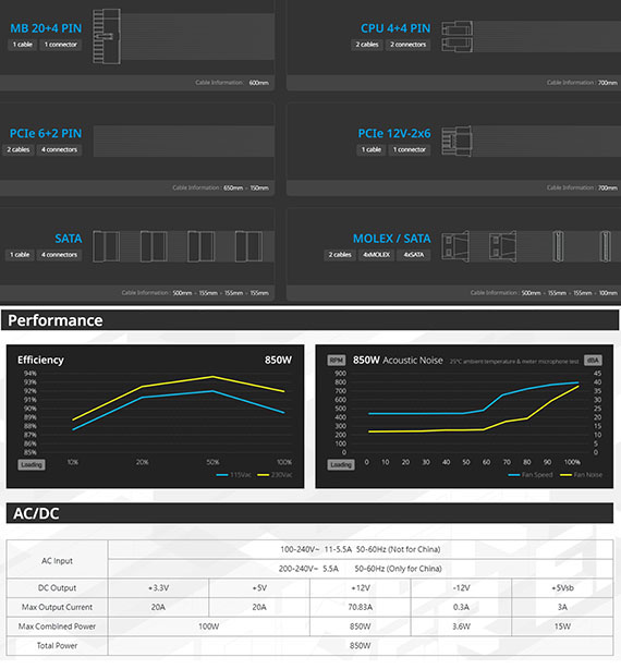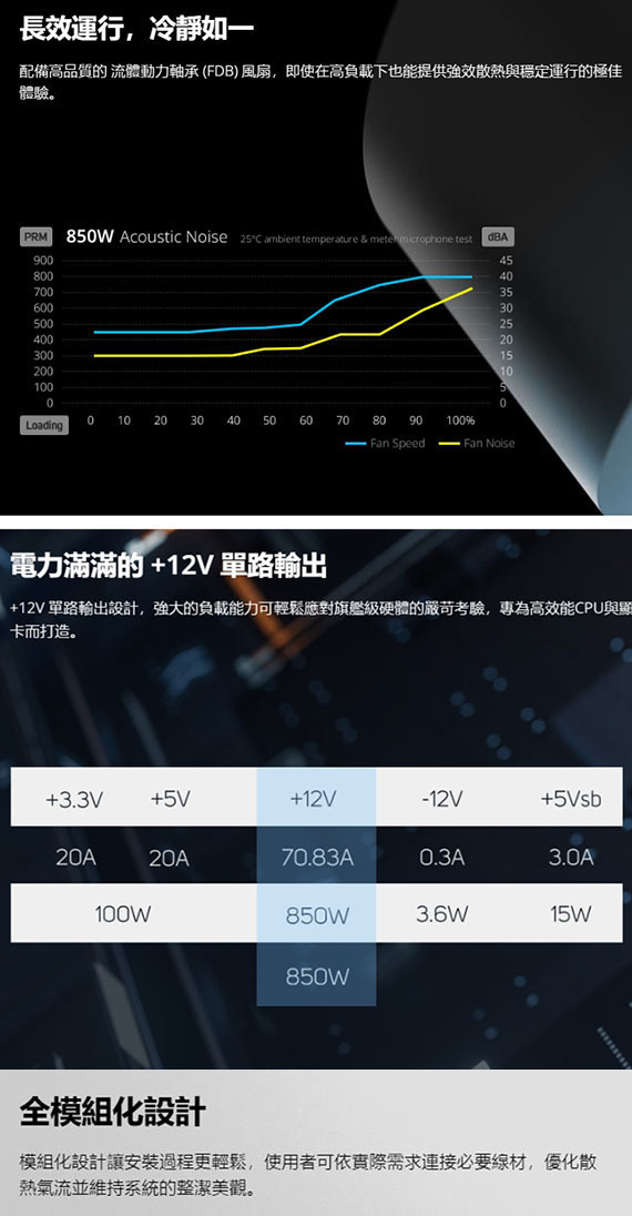 850W,80 PLUS Platinum 白金牌,ATX12V V3.1,FDB 120mm 風扇,線材:MB 20+4 PIN*1、CPU 4+4 PIN*2、PCIe 6+2 PIN*4、PCIe 12V-2x6*1、SATA*4、MOLEX/SATA*4,12V 單路輸出,尺寸140*150*86mm,105°C 日系電解電容,DC-DC 同步整流設計,LLC 諧振線路架構,全模組化扁線材設計,全方位保護機制:OVP、OCP、OPP、OTP、SCP、UVP、SIP、NLO BSMI認證碼: R43001