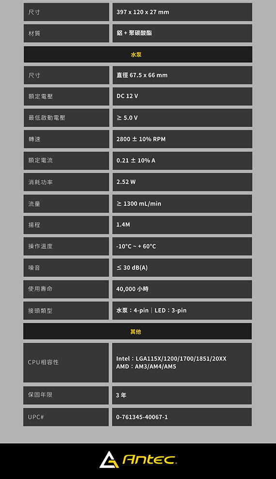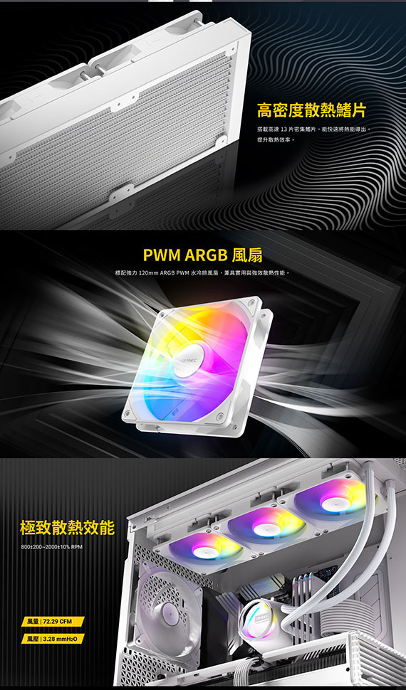支援:INTEL LGA1851/LGA1700、AMD AM3/AM4/AM5,風量:72.29CFM,轉速:800±200~2000±10%RPM,噪音:32dBA,風扇尺寸120*120*25mm,尺寸(含扇):397*120*27mm,幾何骨架造型水冷頭設計,高效能冷卻幫浦,高密度耐用彈性管線,高密度散熱鰭片,大面積銅底板