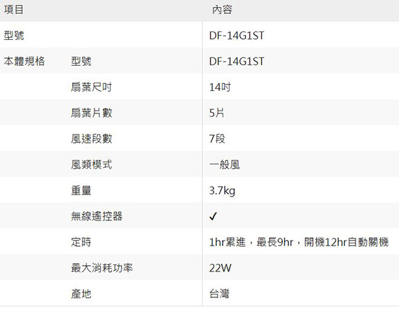 立扇14吋,扇葉5片,7段風速,DC節能,無線遙控設計,適用電壓:110v,機器尺寸(寬*深*高)420×405×770~965㎜,重量:3.7kg,保固1年,BSMI:R3E558 BSMI認證碼: R63080