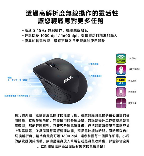 高速RF 2.4GHz無線操作,解析度切換1000dpi/1600dpi,優異的省電效能,光學追蹤,一年保固